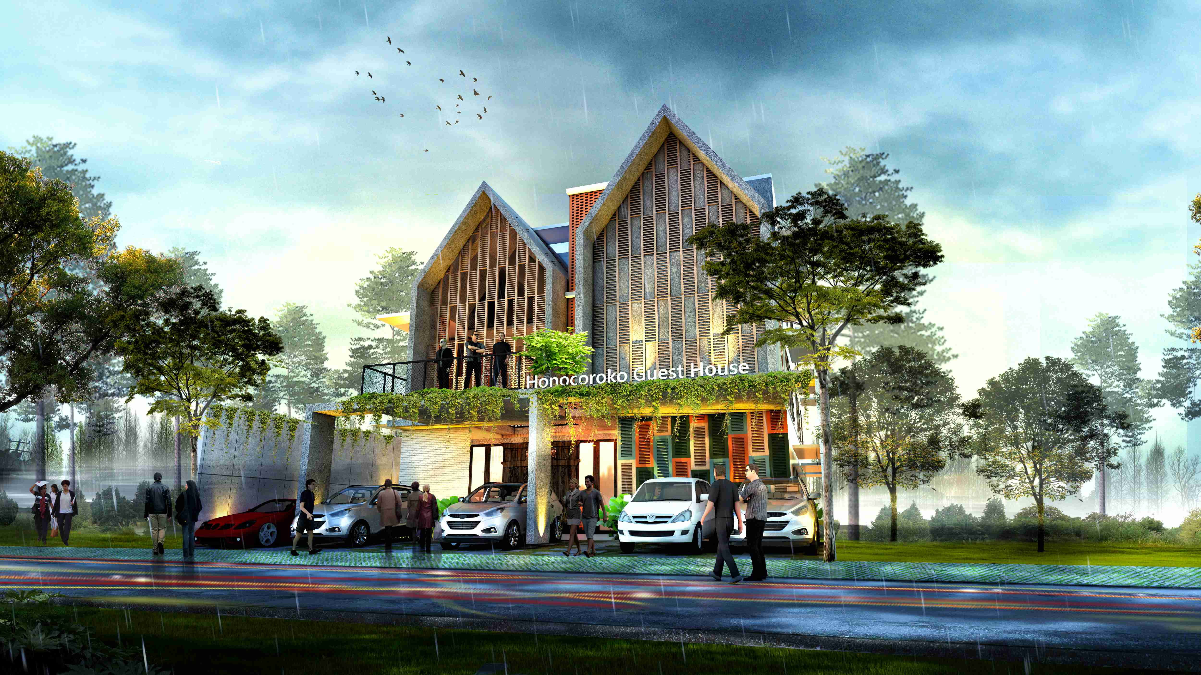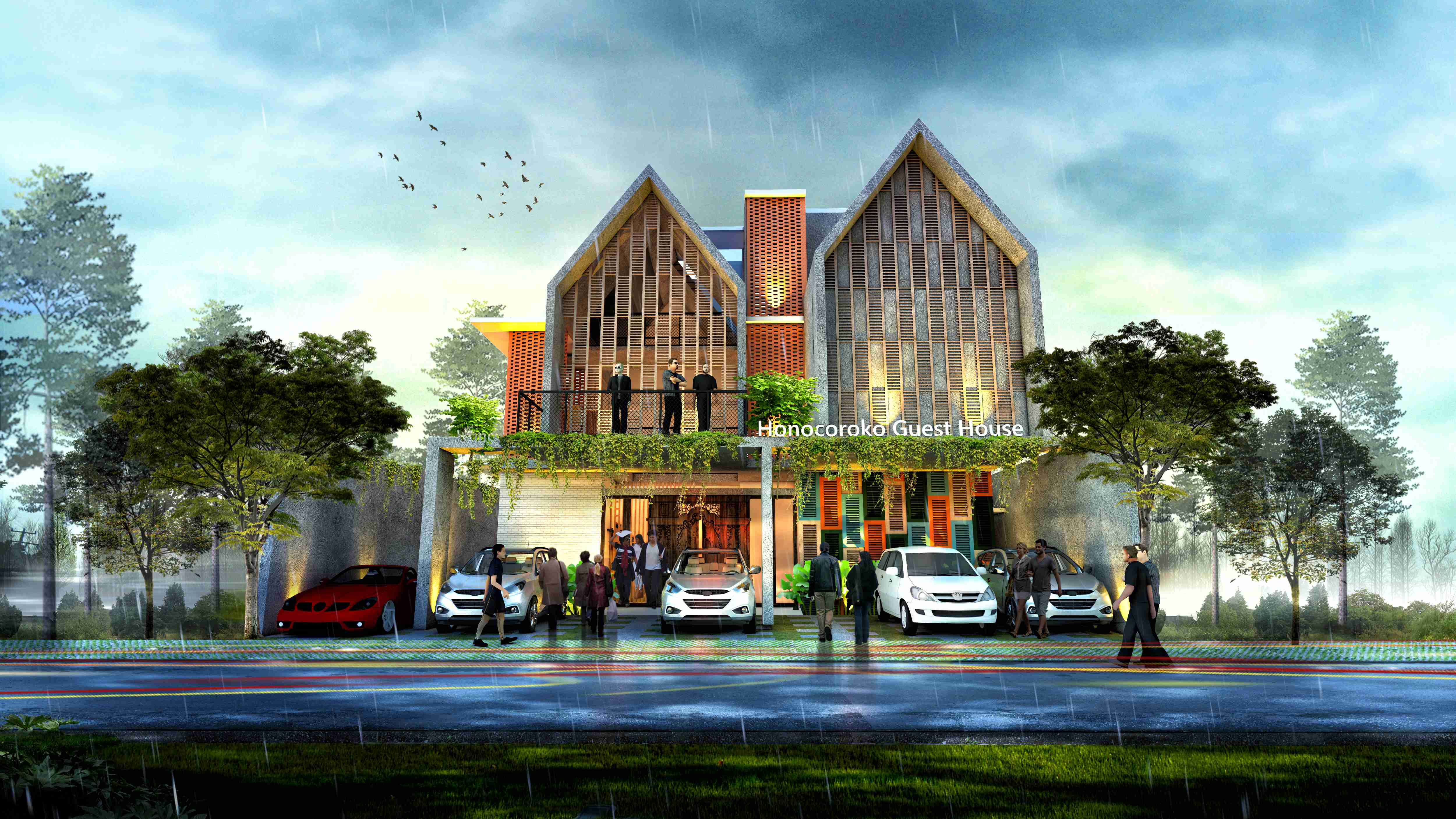 Hanacaraka Guest House, a blend of architectural concepts between concrete exposures, used wood materials, bricks, key tiles, roof lighting, air circulation, cross ventilation, greening etc. A "space order" is a combination of the concept of a daily rental "guest house" and a monthly "boarding house". The layout layout is divided into several zones which are separated but in one unit, between daily functions and monthly functions, the concept of each space has similar characteristics but different concepts and furniture.
